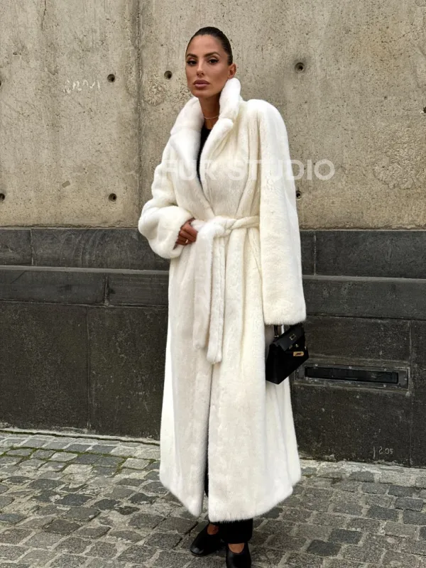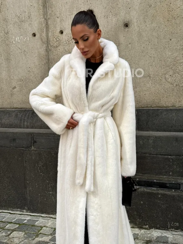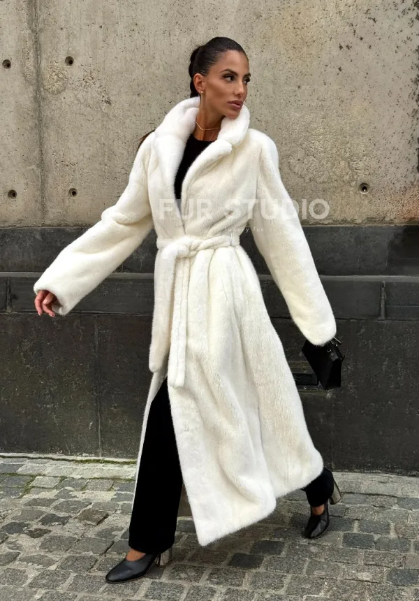 Роскошные рукава добавляют изысканности модели. Шикарные карманы позаботятся о комфорте ручек. Миниатюрная сумочка и грубая обувь сделают ваш образ гармоничным. Качество изделия будет радовать многие годы. Купить белую шубу из плюшевой норки с английским воротником могут дамы, которые обладают безукоризненным вкусом стиля.
