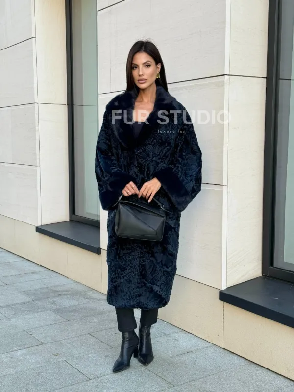 Шуба из каракуля Indigo Blue с отделкой из меха норки, фасон кокон 101105